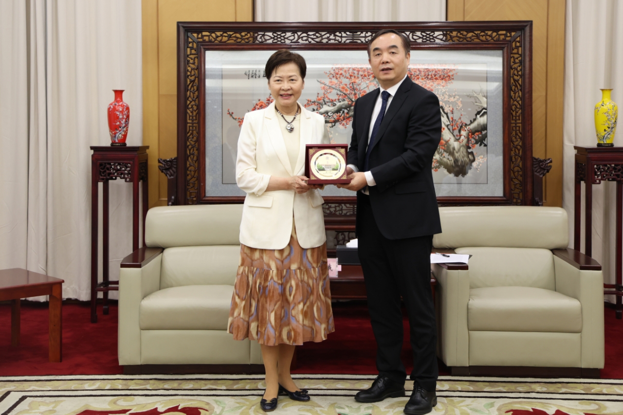 張曉宏代表學校向林鄭月娥贈送蘇州大學紀念品。