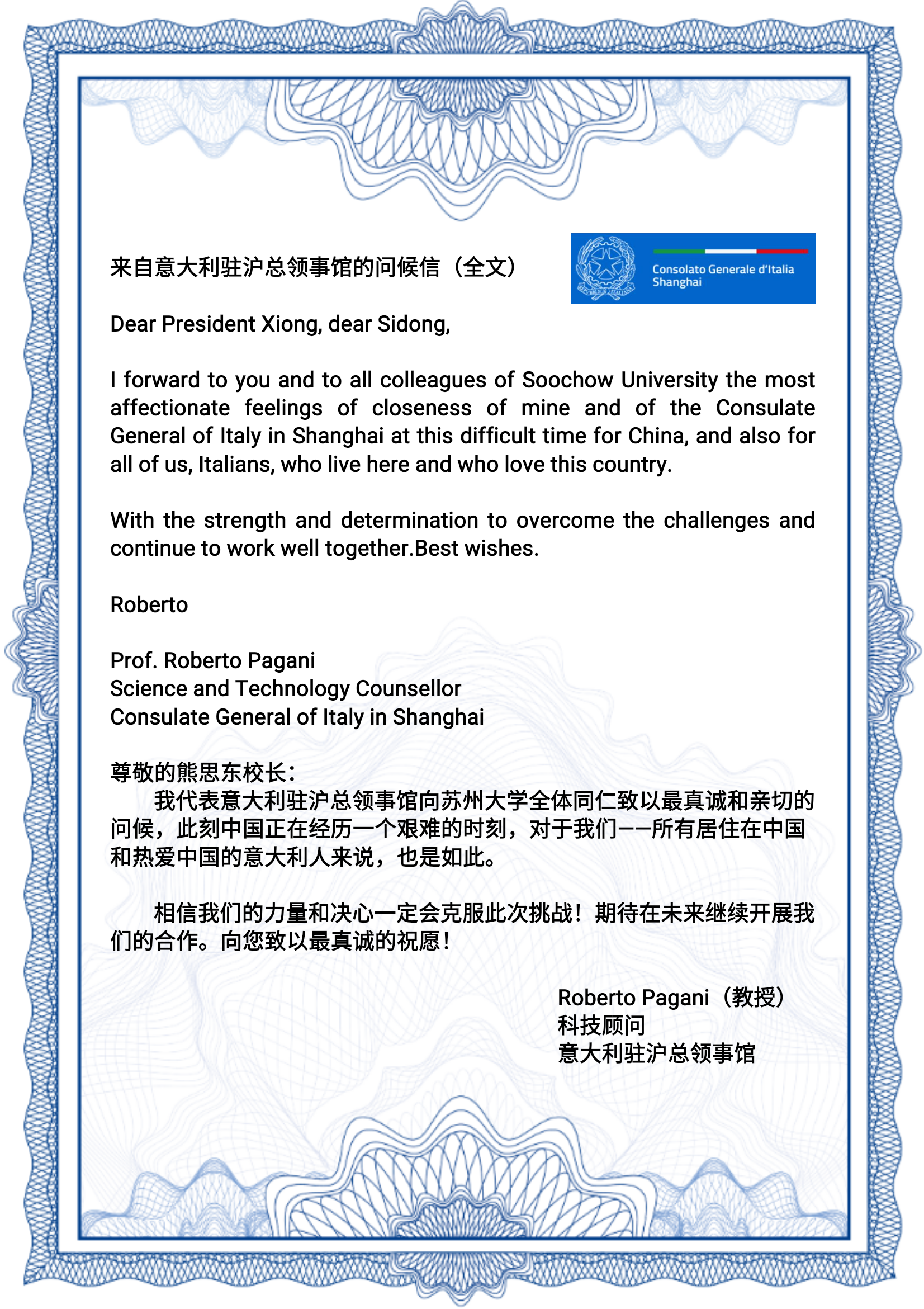 中意友誼源遠流長,根基深厚。國內疫情爆發后,意大利駐滬總領事館在第一時間致信熊思東校長表示慰問。疫情在意大利爆發后,熊思東校長也在第一時間致信問候意大利駐滬總領事館科技參贊Roberto Pagani,信中表示,蘇州大學全體師生深切地牽掛著處于危難時刻的意大利人民,希望意大利朋友們頑強奮戰,早日戰勝疫情!