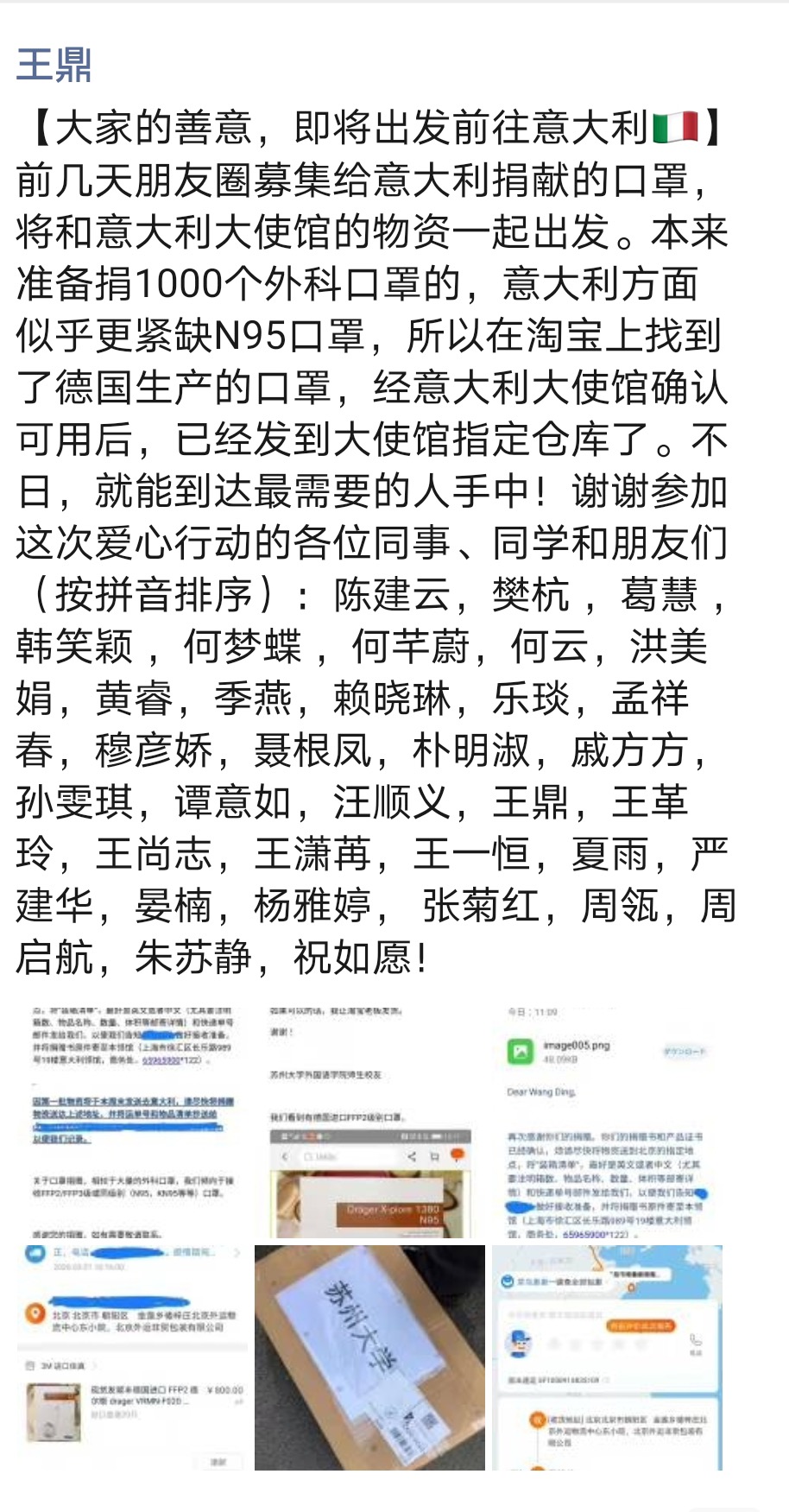與此同時,我校各位師生也密切關注著意大利的疫情動態并積極開展口罩募捐活動。外國語學院師生及畢業院友在日語系主任王鼎的大力發動下,自主自發地募集了一批N95防護口罩,這批口罩已通過意大利駐滬總領事館捐贈給威尼斯大學。