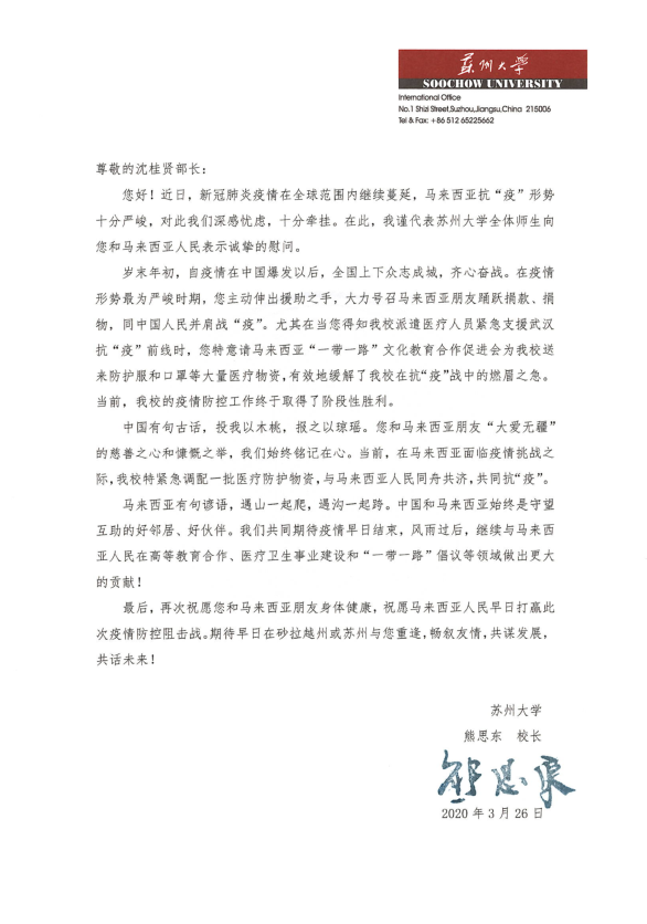 馬來西亞砂拉越州地方政府及房屋部長拿督沈桂賢(Datuk Dr. Sim Kui Hian)一直關注著中國疫情的發展,他組織當地華人華僑積極為中國捐款捐物。當得知蘇州大學派遣了大量醫護人員前往湖北支援后,沈部長特意請馬來西亞“一帶一路”文化教育合作促進會為蘇大送來防護服等醫療物資,并勉勵蘇大師生員工團結抗疫、共克時艱!