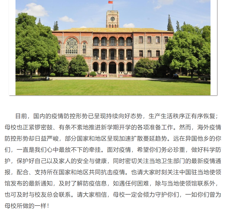同時,學校高度重視海外校友的疫情防控工作,校友總會與各海外校友分會時刻保持密切聯系,及時和海外校友們分享最新的防疫信息和最有效的防疫經驗,并廣泛聯絡、大力動員國內各校友組織,積極協調各方力量以幫助海外校友們共抗疫情,共渡難關。