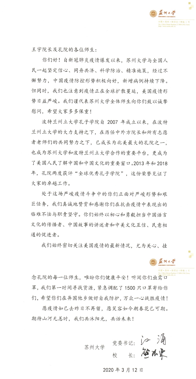 312日,我校疫情防控領導小組副組長、保障工作組組長、黨委常委周高總會計師緊急調配1500只醫用級防護口罩,并在第一時間寄往波特蘭州立大學孔子學院,與之一起寄出的是全體蘇大人的祝福和期盼:愿全體海外漢語教師健康平安、無恙歸來!