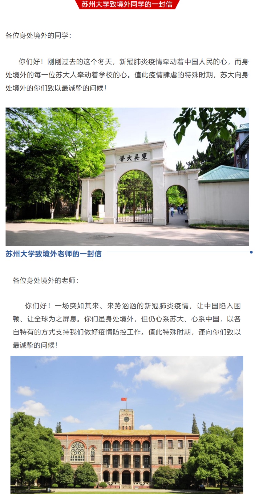 “新冠肺炎疫情牽動著中國人民的心,而身處境外的每一位蘇大人牽動著學校的心。值此疫情肆虐的特殊時期,蘇大向身處境外的你們致以最誠摯的問候!”“惟有相思似春色,東吳好景盼君歸。無論你們身處何方,學校永遠是大家最堅強的后盾。”