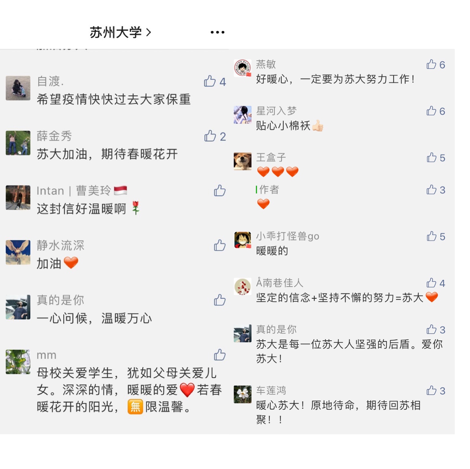 3月下旬,兩封分別題為《蘇州大學致境外同學的一封信》、《蘇州大學致境外老師的一封信》(中英文版)在蘇大官網和官方微信公眾號上發表后,短短半小時內,瀏覽量迅速破萬,讀者們紛紛轉發、點贊,更有讀者留下暖心評論: