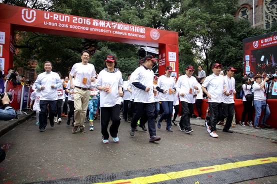 下午,U-run2016蘇州大學校園馬拉松活力賽正式拉開帷幕。我校校領導袁銀男、陳一星、江作軍、楊一心、蔣星紅,江蘇省教育廳體衛藝處處長張鯉鯉,江蘇省體育局綜合處副處長成裕陽,蘇州市體育局局長周志芳,全國高校體育專業委員會副主席、江蘇大學生體育學會主席王家宏,江蘇省體協、省內友好高校體育院系主任,以及我校相關職能部門及學院(部)領導出席了起跑儀式。