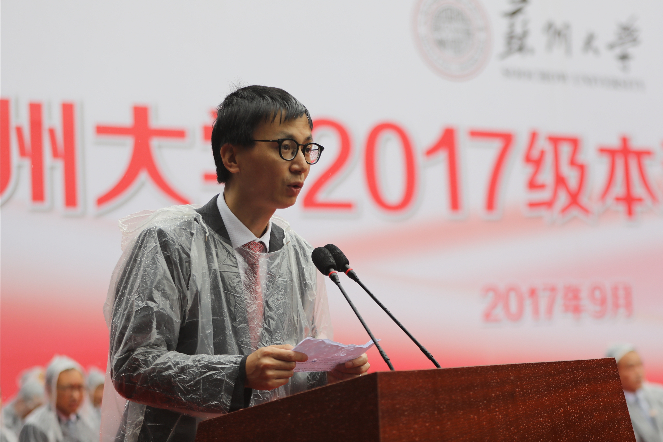 醫(yī)學(xué)部博士生導(dǎo)師蘇雄教授作為教師代表發(fā)言。“一路摸索,這個過程可能會有很多的困難和艱辛,但只要堅(jiān)持,永不放棄,才能發(fā)現(xiàn)自己的興趣在哪里,發(fā)現(xiàn)自己熱愛什么樣的工作。如果你們還沒有發(fā)現(xiàn)自己喜歡什么,那就要不斷去尋找,在學(xué)業(yè)上多接觸專業(yè)以外的知識。” 蘇雄教授從自己與蘇大結(jié)緣的故事說起,鼓勵學(xué)生找到自己的興趣點(diǎn),養(yǎng)成好的學(xué)習(xí)方法和習(xí)慣,充分利用學(xué)校提供的豐厚資源,不斷提升自己,將來為學(xué)校蓬勃發(fā)展貢獻(xiàn)力量。