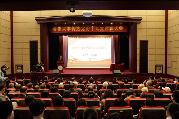 會(huì)上,十九大代表、校黨委常委、副校長(zhǎng)張曉宏從十九大會(huì)議的基本情況、十九大報(bào)告形成過(guò)程、會(huì)議的主要成果、報(bào)告的總體思路和邏輯結(jié)構(gòu)、報(bào)告的主要內(nèi)容和精神實(shí)質(zhì)等方面對(duì)十九大會(huì)議及報(bào)告做了全面系統(tǒng)而詳盡的闡釋。他指出,中國(guó)共產(chǎn)黨第十九次全國(guó)代表大會(huì),是在全面建成小康社會(huì)決勝階段、中國(guó)特色社會(huì)主義進(jìn)入新時(shí)代的關(guān)鍵時(shí)期召開(kāi)的一次十分重要的大會(huì),對(duì)鼓舞和動(dòng)員全黨全國(guó)各族人民繼續(xù)推進(jìn)全面建成小康社會(huì)、堅(jiān)持和發(fā)展中國(guó)特色社會(huì)主義具有重大意義。黨的十九大精神博大精深,準(zhǔn)確標(biāo)定了我國(guó)發(fā)展新的歷史方位,深刻闡明了未來(lái)相當(dāng)長(zhǎng)時(shí)期黨和國(guó)家工作的大政方針和戰(zhàn)略部署,提出了一系列重要思想、重大論斷,作出了一系列戰(zhàn)略部署、戰(zhàn)略安排,站位之高、謀劃之遠(yuǎn)都是前所未有的。張曉宏副校長(zhǎng)還結(jié)合高校工作實(shí)際,詳細(xì)闡述了學(xué)習(xí)十九大報(bào)告的認(rèn)識(shí)與體會(huì):要深刻理解“優(yōu)先發(fā)展教育事業(yè)”的重要意義,深入把握高等教育在新時(shí)代的重要地位和發(fā)展要求;要深入學(xué)習(xí)和貫徹十九大精神,更好地發(fā)揮新時(shí)代高校在“人才培養(yǎng)、科學(xué)研究、社會(huì)服務(wù)、文化傳承創(chuàng)新和國(guó)際合作交流”的五大職能。他強(qiáng)調(diào),蘇州大學(xué)要牢牢堅(jiān)持黨的領(lǐng)導(dǎo),堅(jiān)持以立德樹(shù)人為根本任務(wù),以改革創(chuàng)新為引領(lǐng),加快建設(shè)“國(guó)內(nèi)一流、國(guó)際知名”高水平研究型大學(xué),在新時(shí)代中國(guó)特色社會(huì)主義的偉大實(shí)踐中努力奮斗,為實(shí)現(xiàn)中華民族偉大復(fù)興做出蘇大貢獻(xiàn)。