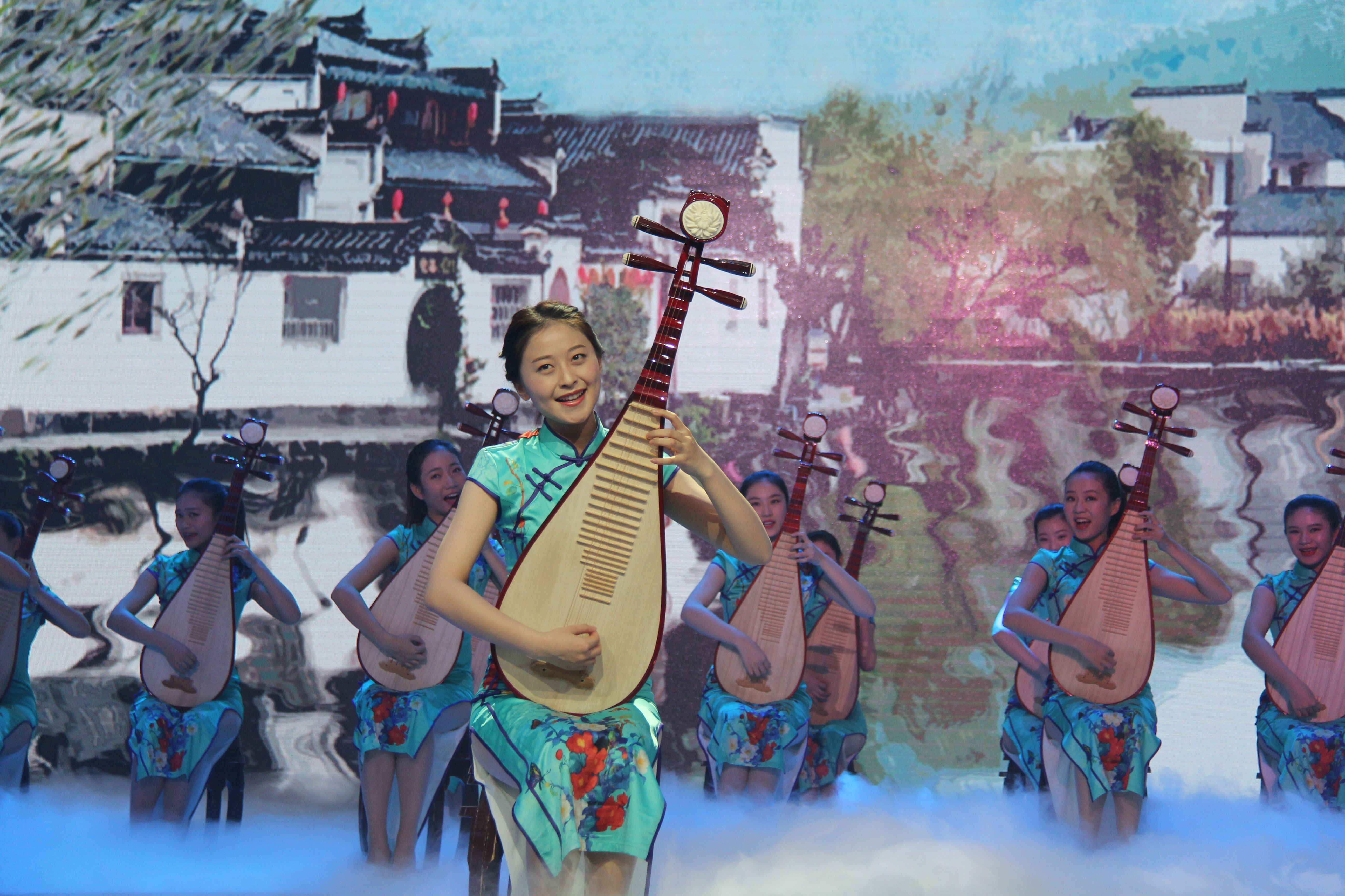 舞臺上,15位姑娘裙裾搖曳、曼妙生姿,她們一對對顧盼生輝的眼眸,一雙雙纖纖的巧手輕撫琵琶, 配以輕清柔緩的吳儂軟語 ,將江南小娘魚的柔美風韻發揮到了極致。
