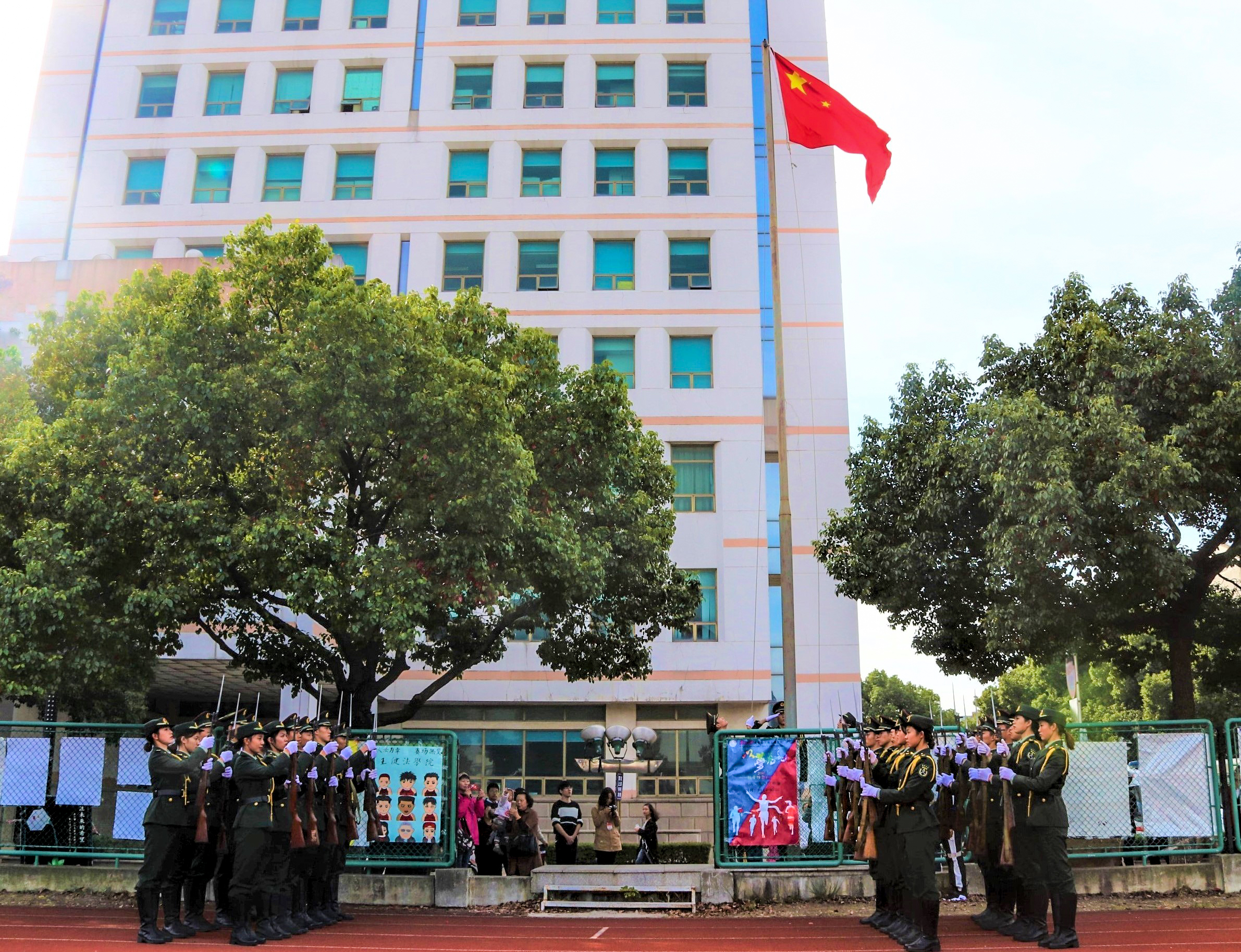 在莊嚴的進行曲中,國旗班擎著鮮艷的五星紅旗,身著整齊的制服,邁著矯健的步伐入場。他們英姿颯爽、氣宇軒昂,象征了我校開拓創新,勇往直前的精神風貌。在全場師生的注目中,國旗緩緩升起,將開幕式推向高潮。