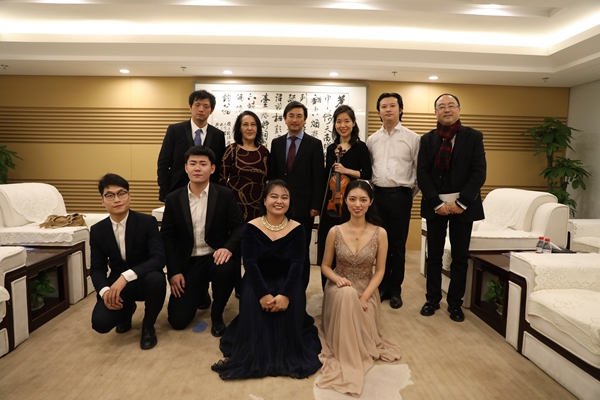 中場休息時,熊思東校長前往后臺親切慰問了蘇州大學交響樂團演出師生代表,感謝他們為本次新年音樂會付出的辛勞和努力,并祝賀大家演出成功。
