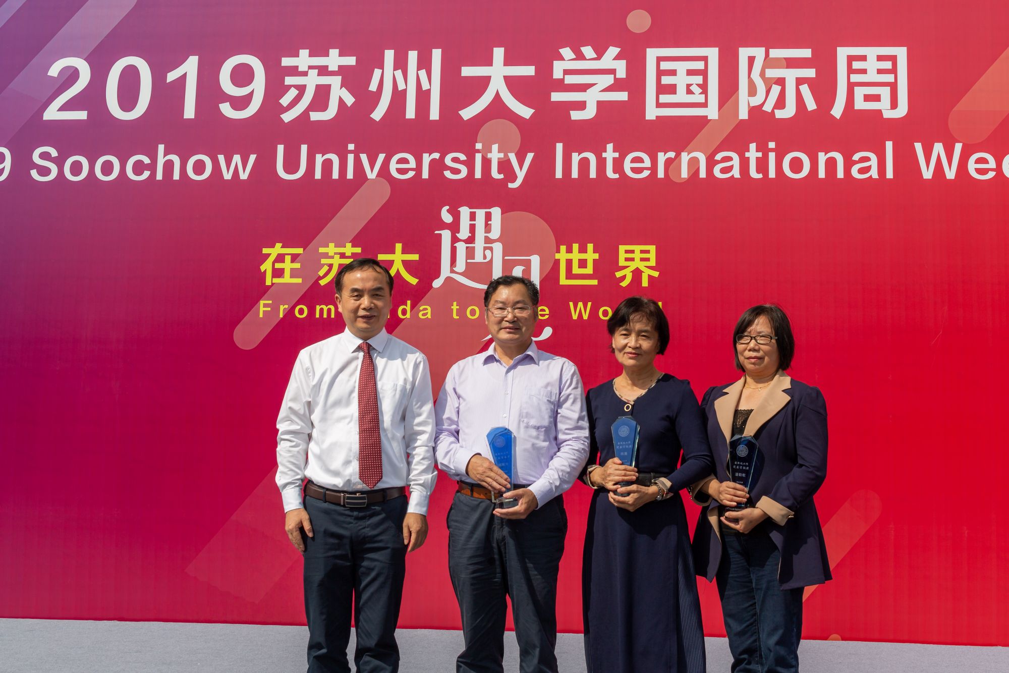 隨后,現場舉行了蘇州大學國際化工作突出貢獻獎頒獎儀式,以此對長期為我校國際合作與交流事業做出突出貢獻、取得重大成果的老師予以表彰。紡織與服裝工程學院的陳雁教授、政治與公共管理學院的鈕菊生教授、材料與化工學部潘勤敏教授分獲此獎項。張曉宏為獲獎老師頒獎并合影留念。