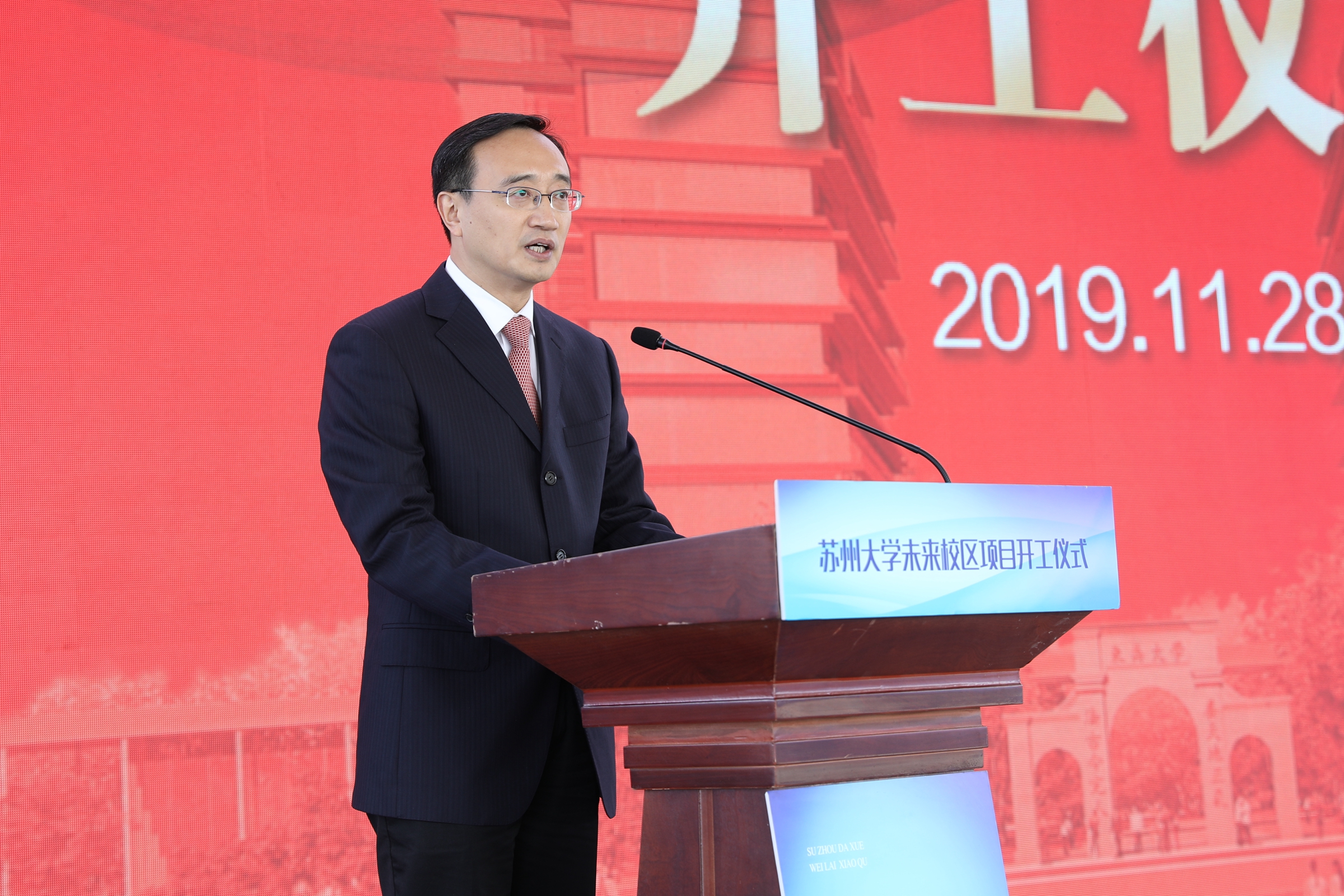 吳江區委書記王慶華在致辭中表示,吳江正處在長三角一體化發展上升為國家戰略的重大歷史機遇期,處于對標國際一流、打造創新湖區、建設樂居之城的攻堅奮進期,蘇州大學未來校區正式開工,為吳江更好推進示范區建設增添了濃墨重彩的一筆。在雙方全面戰略合作框架協議的指引下,蘇州大學未來校區必將融合高品質教育資源,建設高水平學科體系,集聚高層次創新人才,成為吳江高質量發展邁上新臺階的助推器,也將為蘇州大學推進“雙一流”建設做出更大的貢獻。吳江將與蘇州大學攜手打造面向未來的智能化校園的典范,不斷地推動校地協同創新發展邁上新臺階。