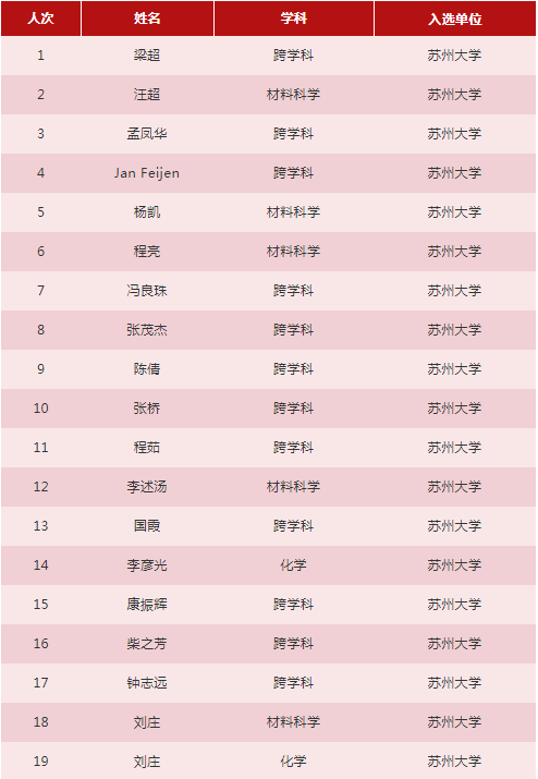 我校入選2019全球高被引科學家名單中,劉莊同時入選了材料科學和化學兩個學科榜單。李述湯、汪超、楊凱、程亮入選材料科學學科榜單;李彥光入選化學學科榜單;梁超、Jan Feijen、孟鳳華、馮良珠、張茂杰、陳倩、張橋、程茹、國霞、康振輝、柴之芳、鐘志遠入選跨學科榜單。