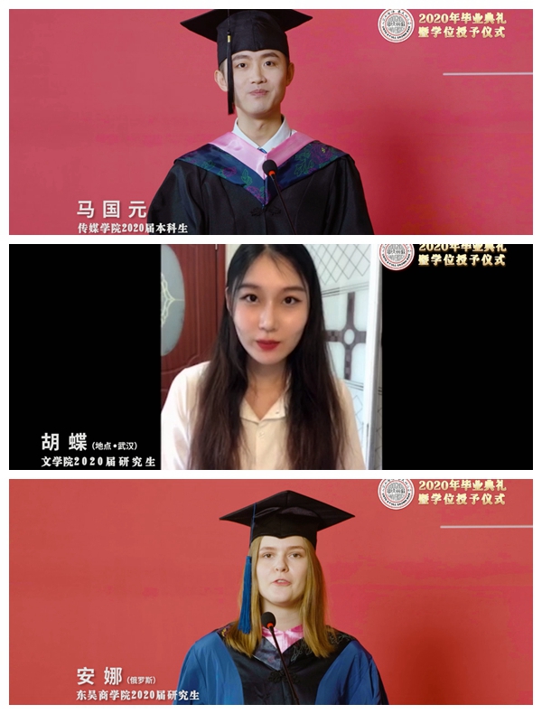 畢業(yè)典禮上,在萌萌的AI機(jī)器人小蘇的全程主持下,傳媒學(xué)院2020屆本科生馬國元、文學(xué)院2020屆研究生胡蝶、東吳商學(xué)院2020屆研究生安娜依次作為畢業(yè)生代表發(fā)言,他們感恩母校的關(guān)愛與培養(yǎng),表達(dá)了對(duì)蘇大的祝愿與對(duì)未來的無限期許。