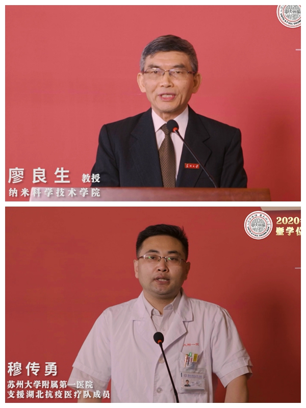 納米科學(xué)技術(shù)學(xué)院廖良生教授、蘇州大學(xué)附屬第一醫(yī)院支援湖北醫(yī)療隊(duì)成員穆傳勇醫(yī)生作為教師代表發(fā)言,表達(dá)了對(duì)畢業(yè)生們的臨別祝福。
