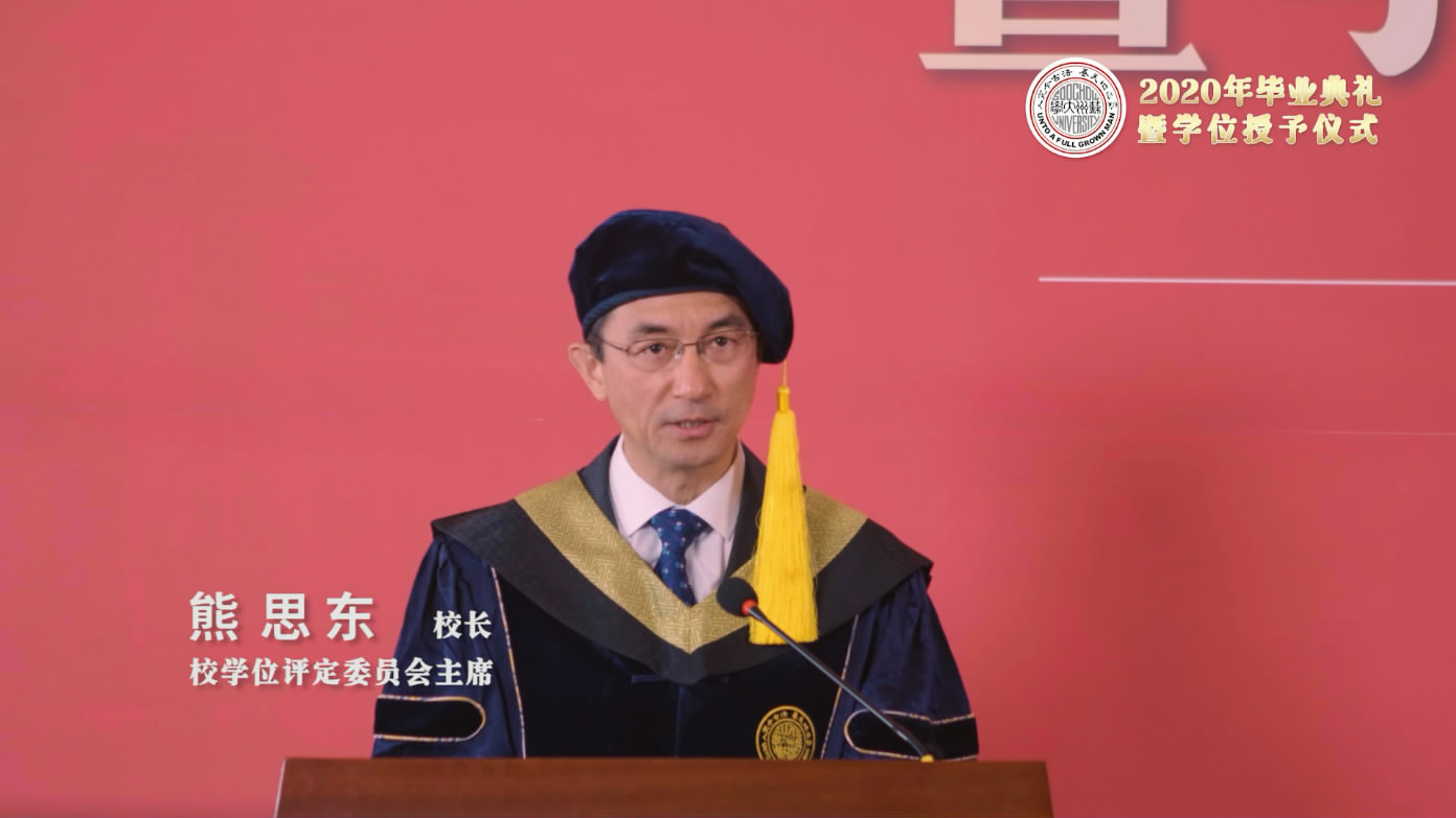 校學(xué)位評(píng)定委員會(huì)主席、校長熊思東向圓滿完成學(xué)業(yè)、即將踏上人生新征程的畢業(yè)生們致以熱烈祝賀。他與同學(xué)們回顧了豐富精彩的大學(xué)校園生活,以及同學(xué)們?cè)谀感5某砷L點(diǎn)滴和曾經(jīng)許諾的青春之約?!?span>2020年,再遇庚子年,蘇州大學(xué)站在新時(shí)代、新甲子的交匯點(diǎn)上,每一位蘇大人都對(duì)新的一年充滿了期待和憧憬。”臨別之際,熊思東校長將深情祝愿化作一次次“相約”,希望能充實(shí)同學(xué)們奔赴前程的行囊,助力大家在新征程中“通關(guān)升級(jí)”。他說,相約2020,不晚起,要奮起;相約2030,不怕輸,不服輸;相約2040,不貪心,守本心;相約2050,不設(shè)限,創(chuàng)無限;相約母校,不戀家,?;丶遥幌嗉s時(shí)代,不拒變,善應(yīng)變;相約祖國,不缺位,守好位,牢記母?!芭R行密密縫”的深情厚意和蘇大人的追求使命?!巴竺繉卯厴I(yè)典禮,你們都有參加的特權(quán),學(xué)校會(huì)準(zhǔn)備好嶄新的學(xué)位服,預(yù)留好VIP坐席,請(qǐng)主禮教授親手為你們扶正流蘇。” 他還與畢業(yè)生們約定,歡迎大家隨時(shí)回到母校,讓今年的遺憾少一些、再少一些。