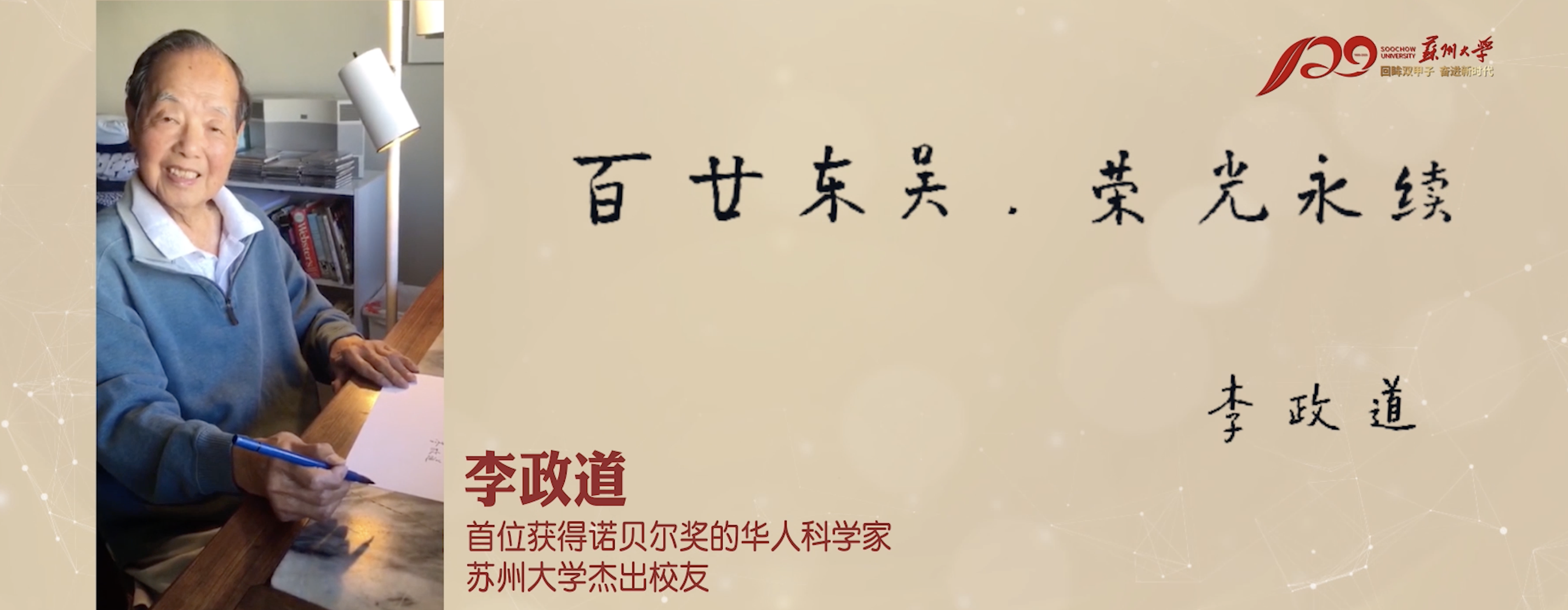 李政道博士一直關心母校的建設發展,心系祖國青年學生成長成才。為了這次發展大會,他特意錄制了一段視頻,并親筆書寫了 " 百廿東吳,榮光永續 " 八個大字贈予母校。各地校友會也紛紛通過“云視頻”的方式,為母校120周年華誕送上祝福。