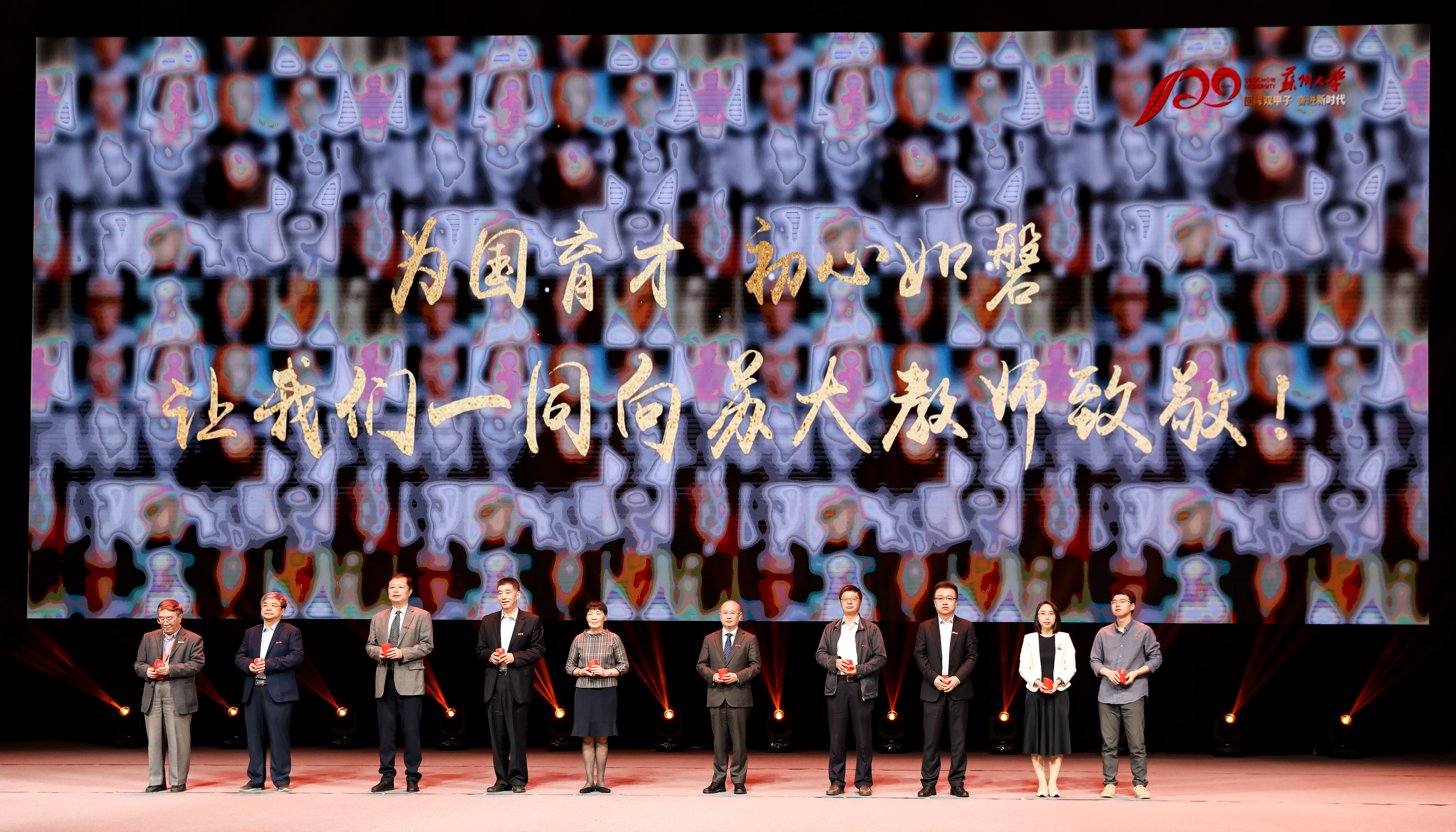 從1900 年創校至今,尊師重教是蘇大賡續一個多世紀的傳統。在發展大會上,中國科學院院士、蘇州大學醫學部放射醫學與防護學院院長柴之芳,全國模范教師代表、體育學院王家宏,新入職優秀青年教師代表、材料與化學化工學部李杰等10 位來自蘇州大學各學院、學科的老中青教師代表依次走上舞臺,點亮手中的紅燭,傳遞師者匠心。