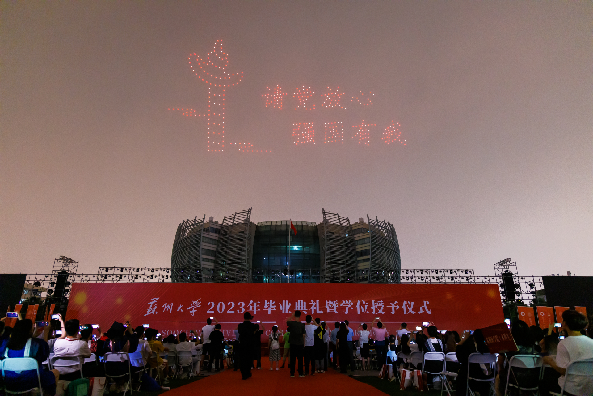 典禮尾聲,一場美輪美奐的無人機表演再次點燃全場。數百架無人機整齊升空,變幻出一幕幕光影畫面。鐘樓、東吳門等蘇州大學標志性建筑以及“養天地正氣 法古今完人”校訓在絢麗燈光下以煙花綻放效果呈現,隨著光影變幻,天空依次出現“請黨放心 強國有我”“成為時代的一束光”“奔赴星辰大海”“蘇大我們永遠的家”“我愛蘇大”等圖案字樣,既飽含母校對遠行學子的深情祝福,更是激勵畢業生牢記黨的教誨母校囑托,志存高遠、腳踏實地,不負韶華、挺膺擔當,以青春之我、奮斗之我建功立業,讓青春在偉大奮斗中綻放光芒!
