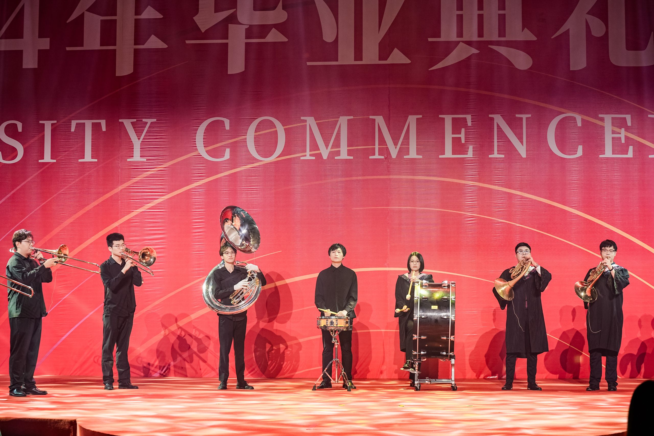 畢業(yè)典禮暨學(xué)位授予儀式在莊嚴(yán)的國歌聲中拉開帷幕,全體出席人員起立唱國歌。