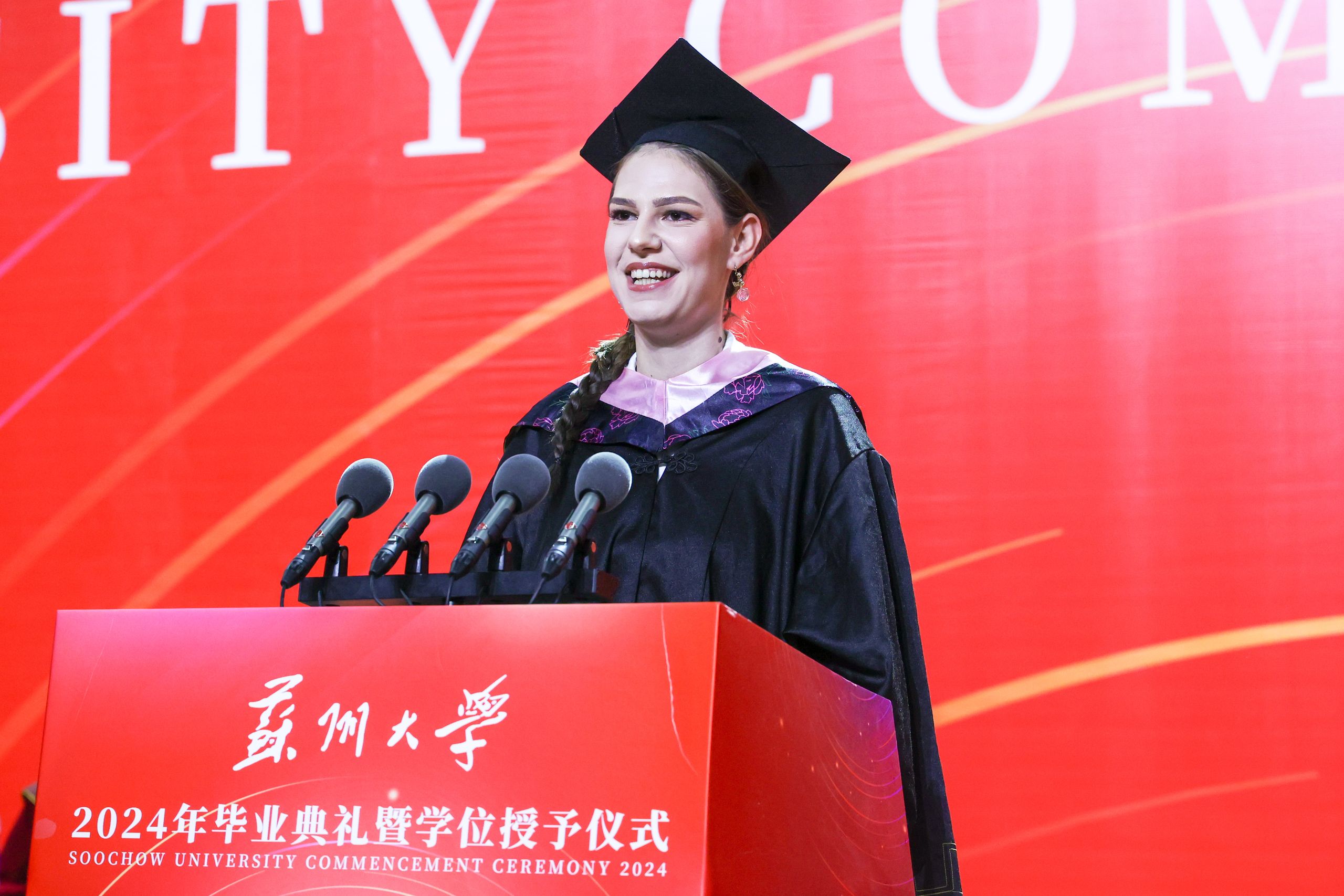留學(xué)生代表、文學(xué)院2020級(jí)漢語言文學(xué)專業(yè)本科生馬一諾,用一口流利的中文回憶了與蘇州的相遇以及在蘇大學(xué)習(xí)生活的點(diǎn)滴。她感謝學(xué)校給予留學(xué)生們體驗(yàn)中國文化魅力、感受中國發(fā)展力量的機(jī)會(huì),也期待利用所學(xué),為促進(jìn)中國、波黑文化交流和國際友誼貢獻(xiàn)力量。